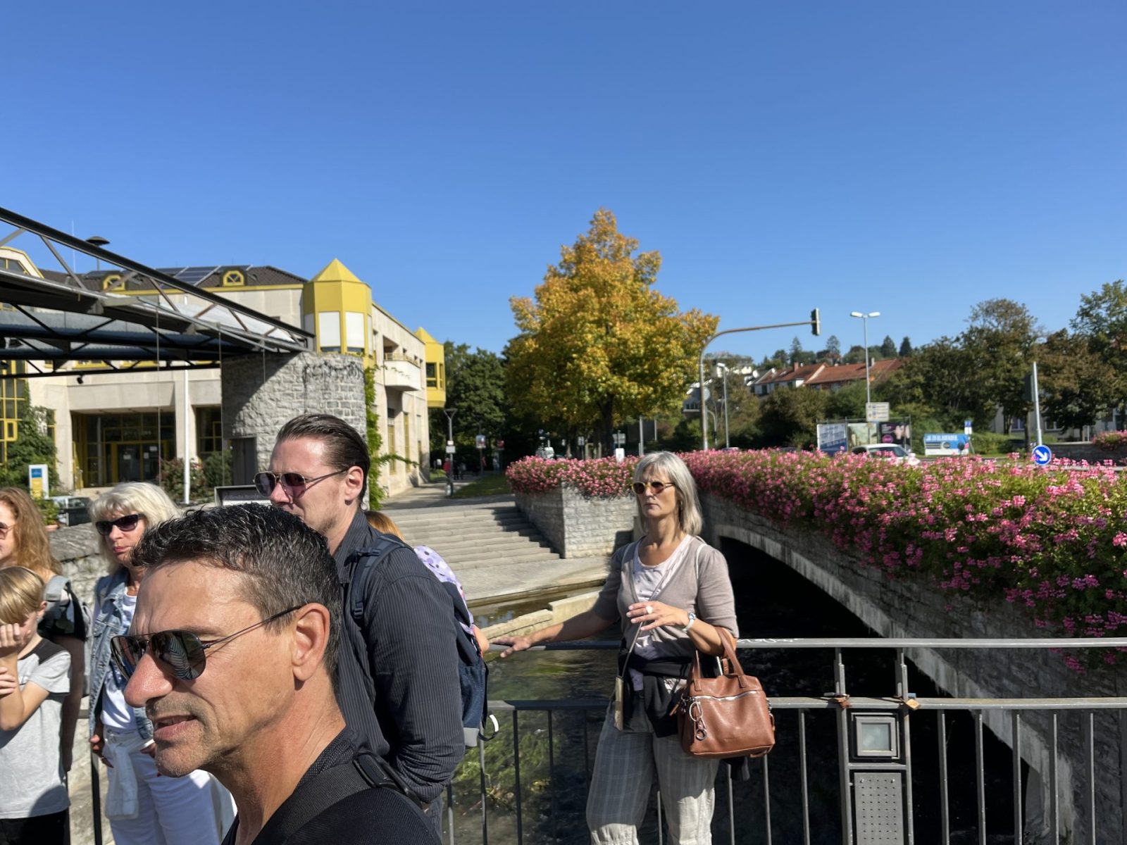 In Bruchsal angekommen, war der 1. Treffpunkt der Reisegruppe in der Nähe des Bahnhofes mit der vorab engagierten Stadtführerin Frau Matzner. Frau Matzner erklärte kurz, was uns heute erwartet und schon ging es bei strahlendem Sonnenschein – ja Kaiserwetter – (wenn Engel reisen ) mit der Gruppe los !