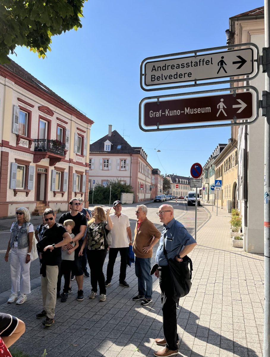 Alle Plätze und Ecken wurden fußläufig erkundet – damit die Gruppe Bruchsal und seine interessanten Ecken auch richtig kennen lernt. Die 1. verdiente Pause hatten wir am Bruchsaler Schloss im sogenannten „ Lottas Schlosskaffee „ welches vorab von unseren lieben Brigitte reserviert und alles Nötige vorbestellt wurde. Bei herrlichem Wetter ist es ein Augenschmaus, vor der Bruchsaler Schlossanlage zu verweilen. Nach der Pause ging unsere Führung peu a peu bis zu den höheren Lagen von Bruchsal weiter. Ob die barocke Schlossanlage mit seinen fast 50 Objekten, die Stadtkirche oder  St. Peter Kirche oder das Belvedere, es war stets ein informativer und kurzweiliger Rundgang, bei welchem wir öfters die Flüsschen „ Saalbach „ und „ Annabach„ überquerten. Die 3 kleinsten Museen Baden-Württembergs durften nicht fehlen und genauso zum Abschluss der tolle Ausblick rund um Bruchsal von der Spitze des Turm „Bergfried“