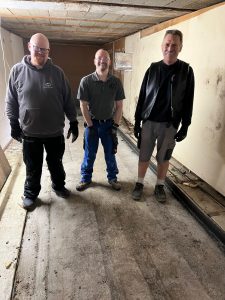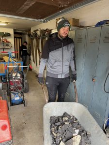 In der Kegelbahn wurde zunächst Holzvertäfelung entfernt und mit der Schubkarre sogleich auf den Parkplatz gefahren. Dann kam mit Jonny der Mann für den Asphalt-Guss. Quadratmeter um Quadratmeter der alten Kugel-Lauffläche wurde angelüpft und mit Edes altem Hammer angetrümmert. Die Stücke wurden dann zum Fenster getragen und in die davor wartenden Schubkarren gelegt. Handarbeit. Und dann mit den Schubkarren auf den Parkplatz gefahren. Viel Handarbeit, viel schwer. Fast wir Untertage beim Kohleabbau bei den Knappen. Dank des engagierten Auftretens der Arbeitsdienstler konnte der komplette Asphalt-Guss entfernt werden. Stark. Capo Volker war happy.