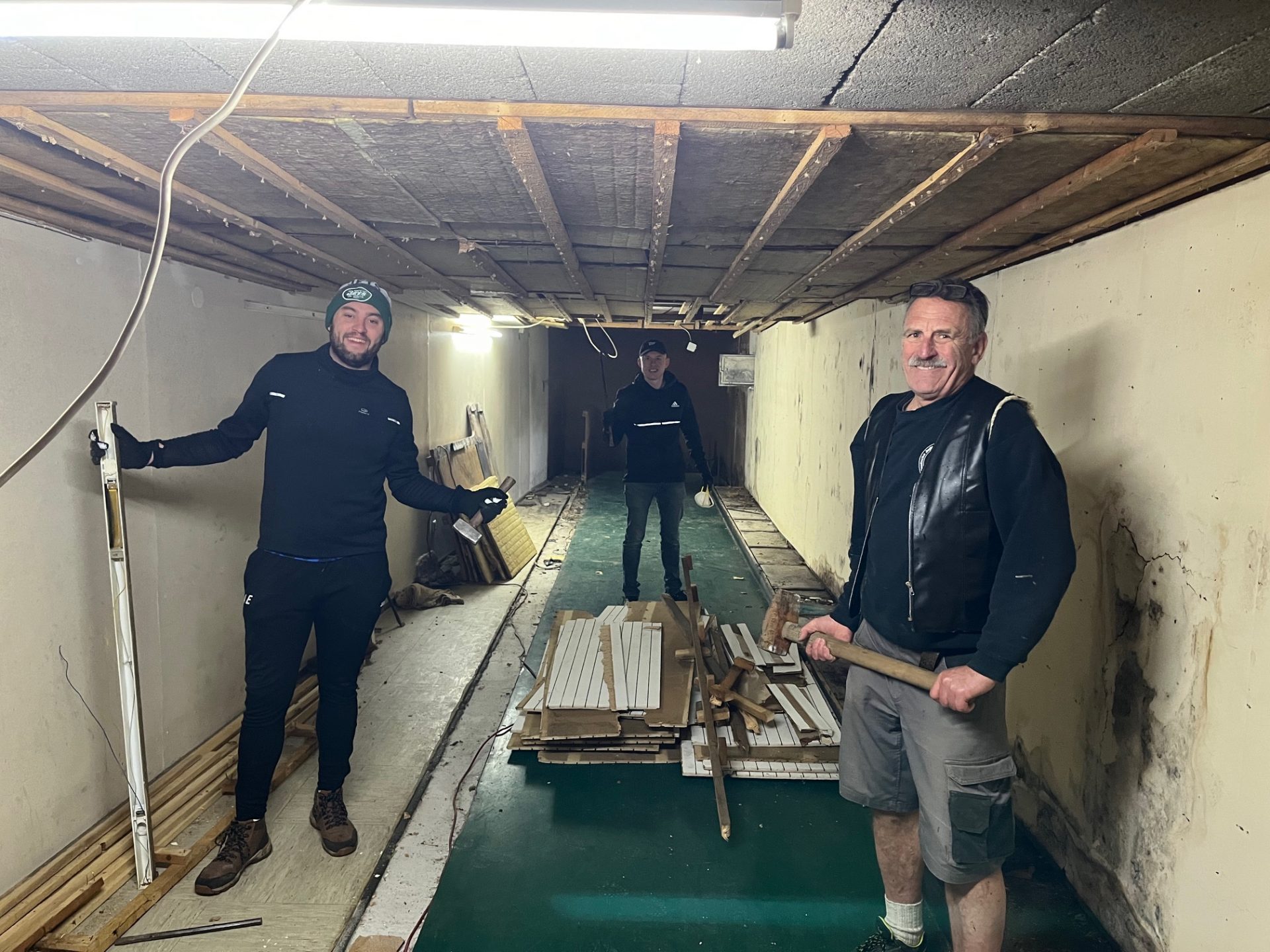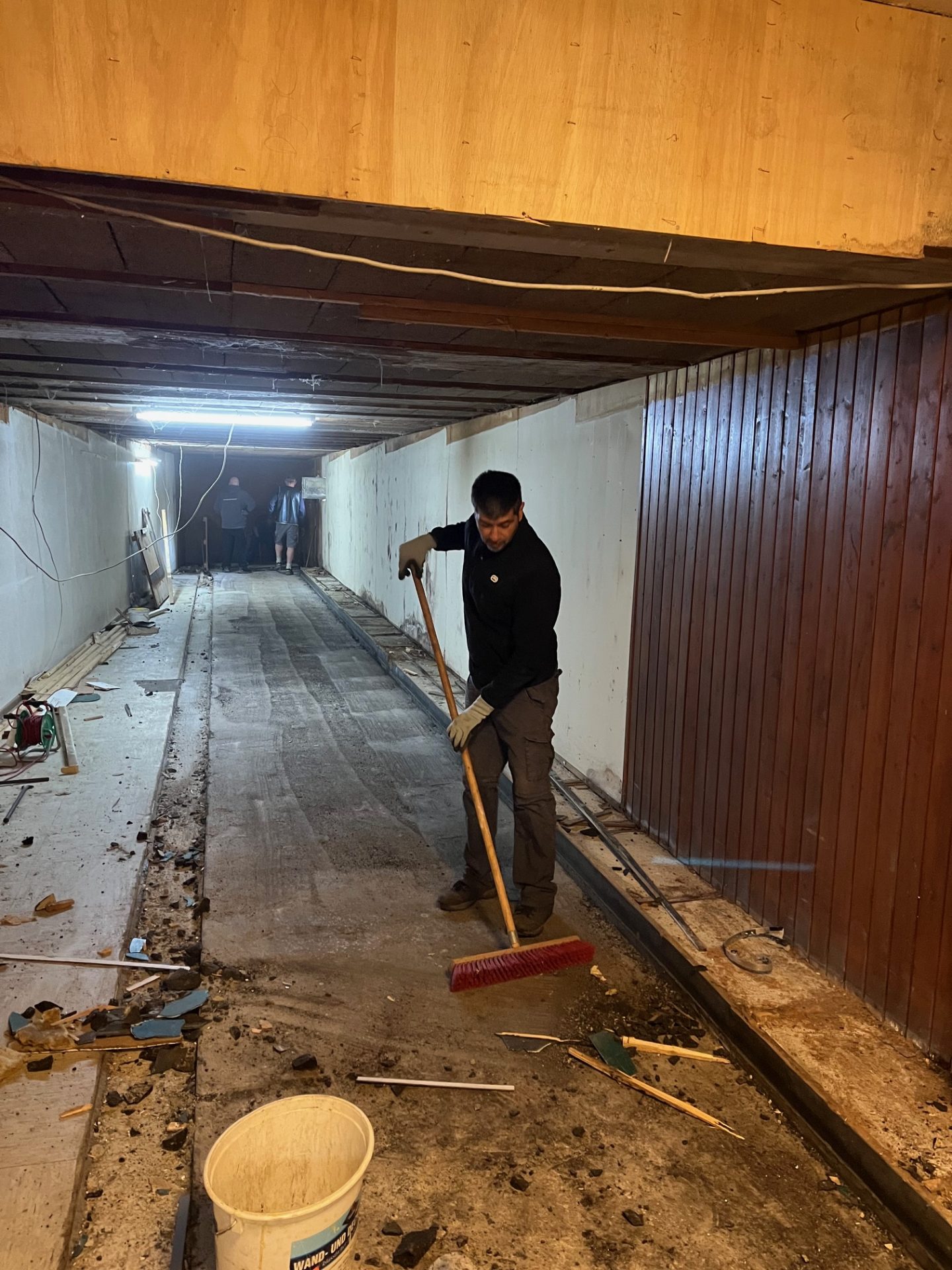 In der Kegelbahn wurde zunächst Holzvertäfelung entfernt und mit der Schubkarre sogleich auf den Parkplatz gefahren. Dann kam mit Jonny der Mann für den Asphalt-Guss. Quadratmeter um Quadratmeter der alten Kugel-Lauffläche wurde angelüpft und mit Edes altem Hammer angetrümmert. Die Stücke wurden dann zum Fenster getragen und in die davor wartenden Schubkarren gelegt. Handarbeit. Und dann mit den Schubkarren auf den Parkplatz gefahren. Viel Handarbeit, viel schwer. Fast wir Untertage beim Kohleabbau bei den Knappen. Dank des engagierten Auftretens der Arbeitsdienstler konnte der komplette Asphalt-Guss entfernt werden. Stark. Capo Volker war happy.