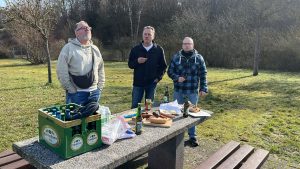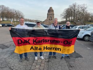 Am Samstag ging’s pünktlich los, um 8.30 Uhr. Volker und Jonny und Hagen und Heinz. Erstes Fahrziel war Leipzig, das Denkmal zur Völkerschlacht. Und da der Weg ja bekanntlich das Ziel ist, haben wir uns zunächst auf das gute Auswärtsspiel-Vesper gefreut: König-Ludwig-Brot, Hausmacher vom Metzger, Käse und Apfel. Und ein Getränk, trinken ist wichtig.