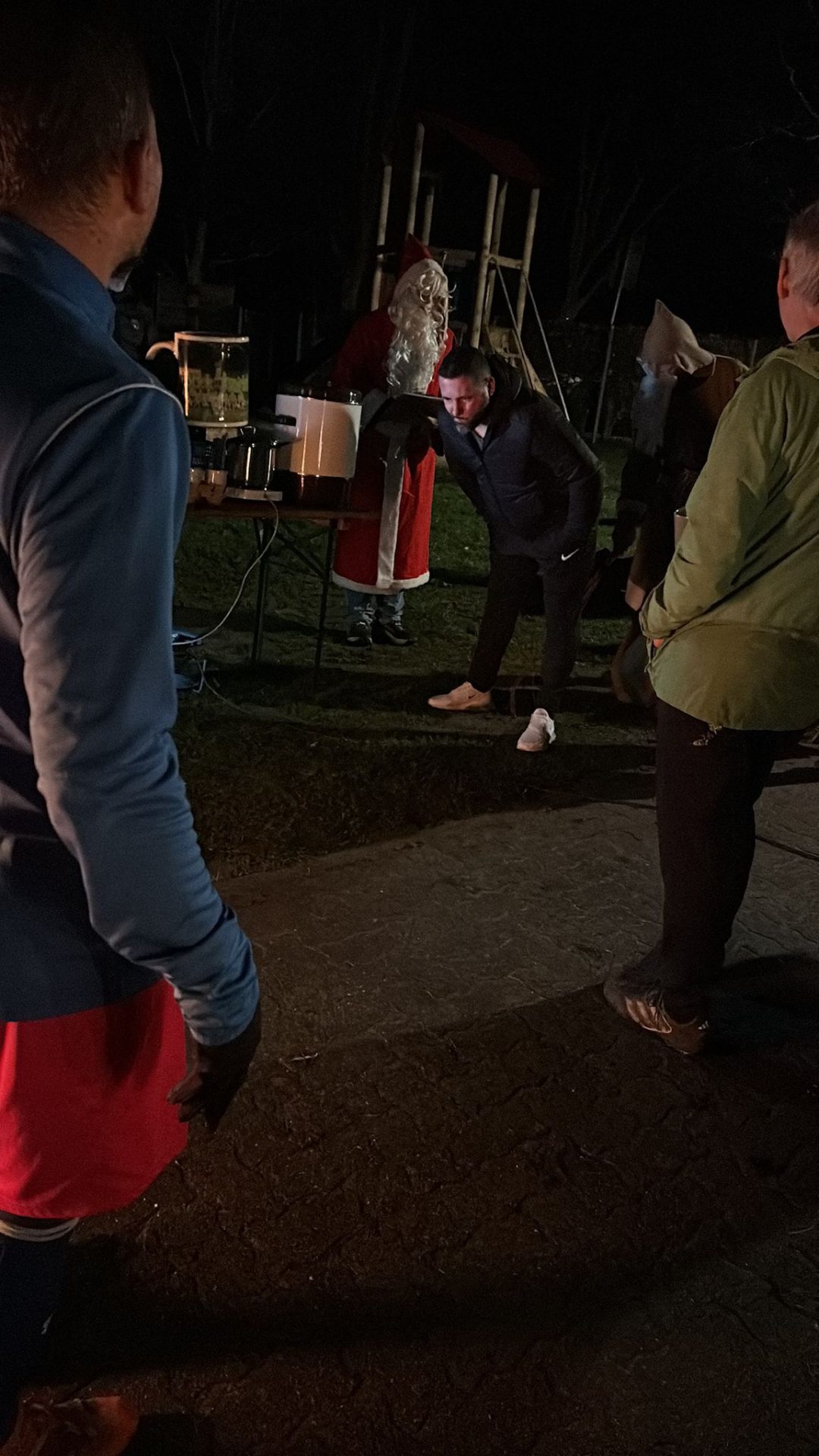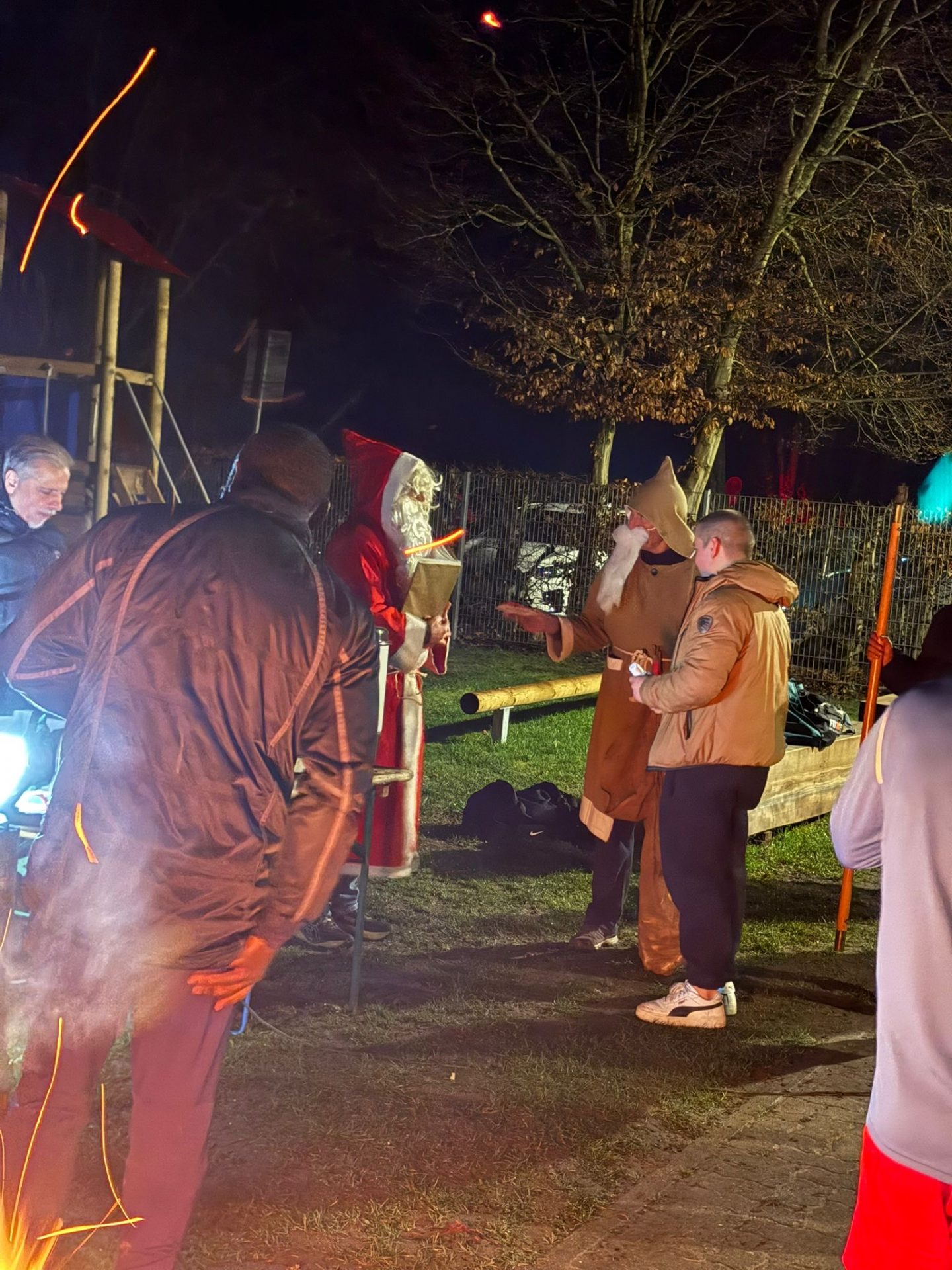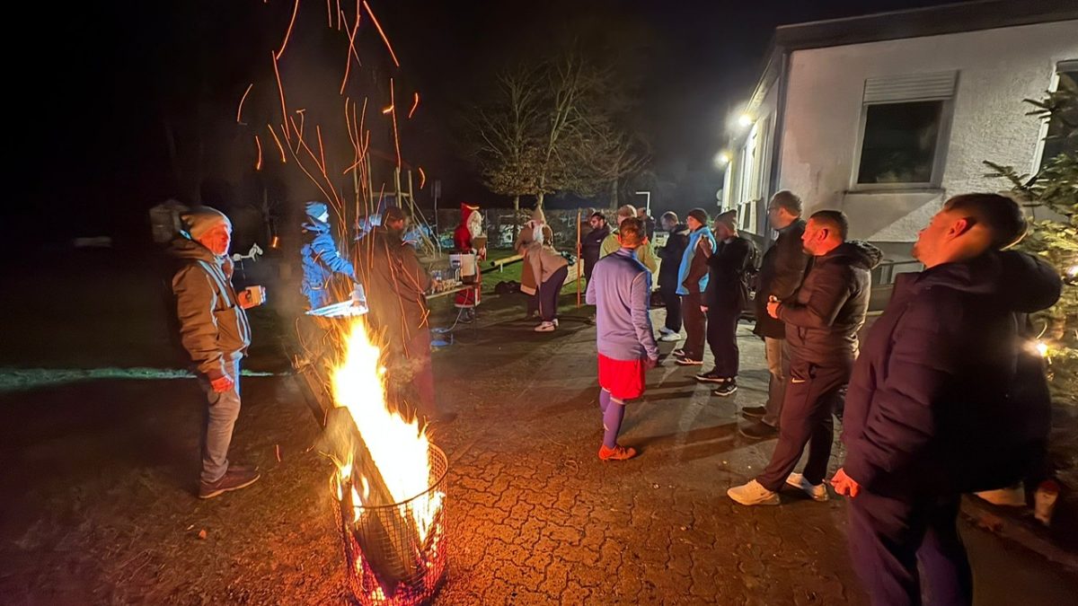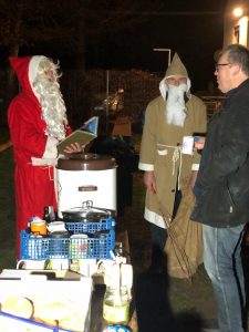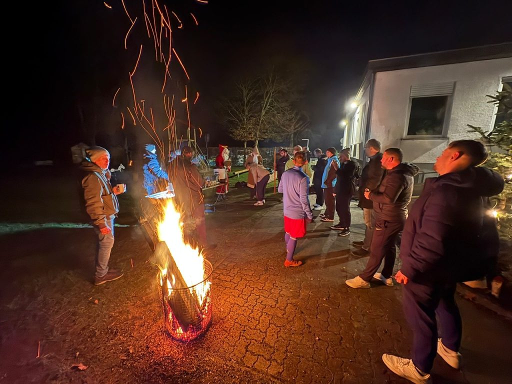 Und so hat Volker am 10. Dezember, kurz vor Weihnachten, den Grill angezündet, so dass in durchaus weihnachtlicher Stimmung die Spieler und Betreuer und Zuschauer nach dem Training zusammen kommen konnten. Bei einem Kaltgetränk, einem alkoholfreien Punsch, einem Glühwein, einem Zimtstern, einer Bratwurst und – wer Glück hatte, der Abteilungsleiter gehörte nicht dazu – bei einem wunderbaren Sucuk-Weck. Apropos Sucuk. Nicht zufällig wurde diese wohlschmeckende türkische Spezialität in der Nähe von Demre, also Myra, erfunden. Und angelockt vom Duft, der die Tannenspitzen zart umspielte, jene Tannenspitzen, wohlbekannt aus ‚Allüberall auf den Tannenspitzen, sah ich goldene Lichtlein sitzen; und droben aus dem Himmelstor sah mit großen Augen das Christkind hervor,…‘ traten plötzlich zwei wilde Gestalten in die Mitte der genießenden Runde: Knecht Ruprecht und sein Chef aus Myra, der hl. Nikolaus. Für die guten Buben hatten sie warme Worte, für die nicht-immer-ganz-so-guten Buben hatten sie die Rute dabei. Und jene musste Ruprecht oft auf dem Gesäß der Buben tanzen lassen.